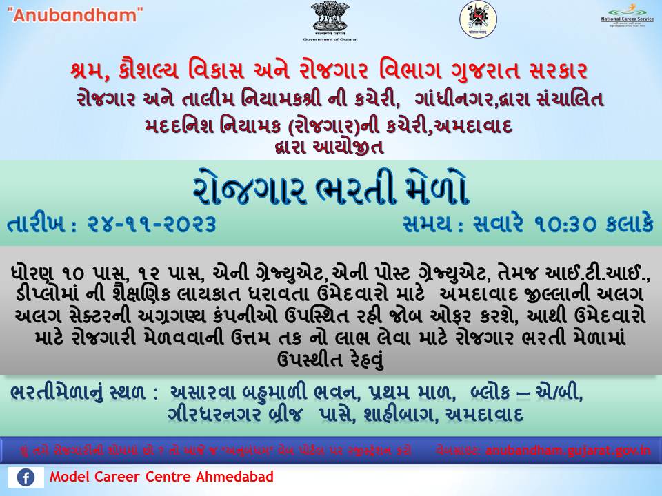Model Career Centre, District Employment Exchange Office, Ahmedabad has published an Advertisement for Rozgaar Bharti Melo 24-11-2023. Eligible Candidates are advised to refer to the official advertisement and apply for this post. You can find other details like age limit, educational qualification, selection process, application fee, and how to apply are given below.